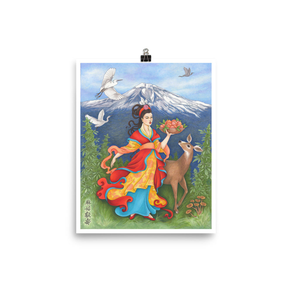 Maiden Magu is the Chinese Taoist Immortal of longevity, prophecy, history, and hemp. Cannabis is sacred to her, as are deer, egrets, and peaches. Her path is the “Way of Infinite Harmony” and she is honored for her commitment to freeing people from that which enslaves them. It is said that when the Immortals gathered for a feast, Magu prepared a special longevity wine and gave it to Xi Wangmu, the great Empress of the Western Heaven. Xi Wangmu was so impressed with the elixir that she granted Magu immortality. She is shown here in a field of cannabis where the city of Weed is situated, just north of the sacred mountain in Siskiyou county. She holds a dish of peaches, the fruit of immortality, and a cluster of reishi mushrooms grows at her feet, also known for their healing and life-extending qualities. Her sumptuous robe is a vibrant red, the color of life, health, and longevity. A gentle mule deer doe looks up at her with adoring eyes, and three snowy egrets fly overhead. Her name, Magu Xian Shou, in Chinese characters appears at the bottom left.